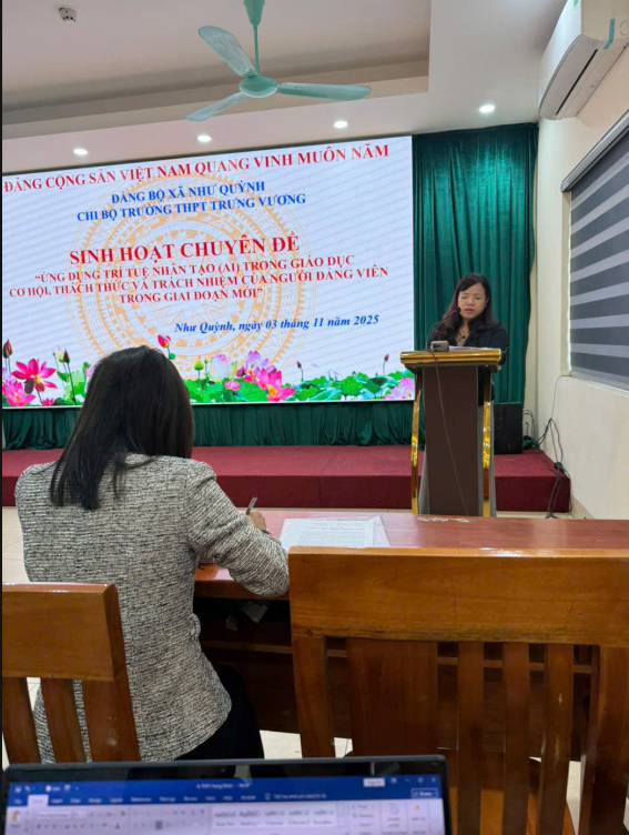 Thực hiện Điều lệ Đảng Cộng sản Việt Nam; Quy định số 294-QĐ/TW, ngày 26/5/2025 của Ban chấp hành Trung ương về thi hành Điều lệ Đảng; Chỉ thị số 50-CT/TW ngày 23/7/2025 của Ban bí thư về tiếp tục đổi mới nâng cao chất lượng sinh hoạt chi bộ trong thời kỳ mới; HD số 42-HD-BTCTW, ngày 28/10/2025 v/v thực hiện chỉ thị số 50-CT/TW, ngày 23/7/2025 của Ban bí thư về tiếp tục đổi mới nâng cao chất lượng sinh hoạt chi bộ trong thời kỳ mới; Được sự nhất trí của BTV Đảng uỷ xã Như Quỳnh; Chi bộ Trường THPT Trưng Vương (Đảng bộ xã Như Quỳnh) đã tổ chức buổi sinh hoạt chuyên đề quý IV năm 2025 với nội dung: “Ứng dụng Trí tuệ Nhân tạo (AI) trong giáo dục – Cơ hội, thách thức và trách nhiệm của người đảng viên trong giai đoạn mới”. Buổi sinh hoạt chuyên đề đã diễn ra với không khí trang nghiêm, cởi mở và sáng tạo, thể hiện tinh thần tiên phong, đổi mới, trách nhiệm của đội ngũ đảng viên – nhà giáo trong thời đại số.